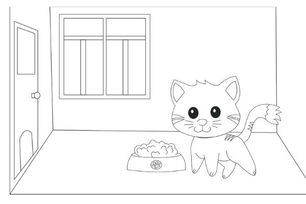 If you want an indoor cat coloring page you can choose this one instead. This lovely kitten is getting ready to tuck into a bowl of cat food.