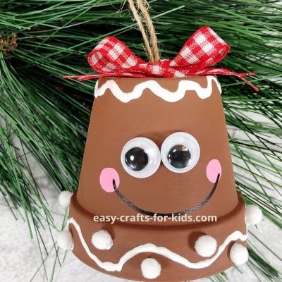 This Clay pot Gingerbread Woman craft is a great Christmas painting activity for kids this Winter. STEP ONE Gather all materials and then remove the packaging and labels. Basecoat the entire 2.5” clay pot with dark brown acrylic craft paint. Let the paint dry and then apply a second coat, if necessary. STEP TWO Attach two googly eyes to the gingerbread person with a glue gun and glue sticks. Add polka dot cheeks to the gingerbread person’s face by dipping a new pencil eraser into pink acrylic craft paint. Set aside to dry. Draw a squiggle line around the rim of the clay pot with white dimensional paint. Attach the mini white pom poms to the rim of the clay pot with the dimensional paint. Set aside to dry. TIP: You can use liquid craft glue for this project, but you would have to wait for it to dry. STEP THREE Add a squiggle line around the top of the Gingerbread person with white dimensional paint. Draw a smile from cheek to cheek with a permanent black marker. STEP FOUR Cut a 12” length of natural jute twine, tie it in a loop with a knot, and attach to the top of the clay pot Gingerbread person with a glue gun and glue sticks. Tie red and white gingham ribbon into a bow and glue to the top of the clay pot.