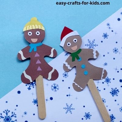 These DIY Gingerbread Man Bookmarks are the perfect Christmas craft for lovers of Gingerbread men. Gather the supplies and print out the PDF template for the gingerbread bookmark craft. Now, glue the white zigzag paper pieces on the gingerbread man. Then, glue the buttons on the chest area. Glue the hat’s lace on the bottom part of the hat. Glue the hat on top of the gingerbread man’s head. Glue the scarf on the neck of the gingerbread man. Then, glue the eyes and mouth to the gingerbread man’s face. Step 8: Use a marker pen to draw the eyeballs. Glue a popsicle stick on the back of the gingerbread man. You can use this as a puppet or a cute Christmas bookmark.