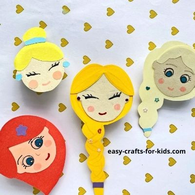 Learn how to make paper Princess rings! One of my most favorite crafts for girls. They get to wear Elsa, Rapunzel, Ariel and Cinderella on their fingers! To make these adorable paper princess rings for kids, you need to fetch all the listed supplies and print out the templates. Cut out the pieces for princess Elsa using the PDF templates. First, glue the long hairpiece on the back of the head. Allow the glue to dry. Now take the fringe and glue it on the top front of the head. Use colorful marker pens to draw the face and eyes. Cut out a long cardstock piece, make sure it is at least 2 or 3 centimeters longer than the circumference around your finger. Then roll it into a ring/circular shape. Wrap both ends together with tape or glue. Glue the ring on the back of Elsa’s head to finish your craft. Step 7 Repeat these steps for the other 3 paper Princesses