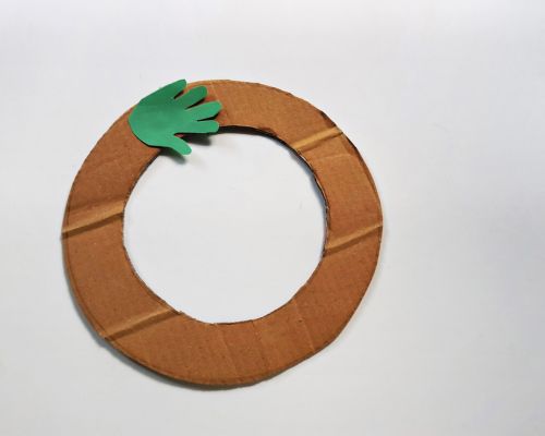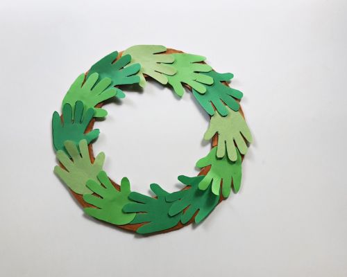 Apply glue on the wreath base and start attaching the handprint cut-outs on the base one by one.